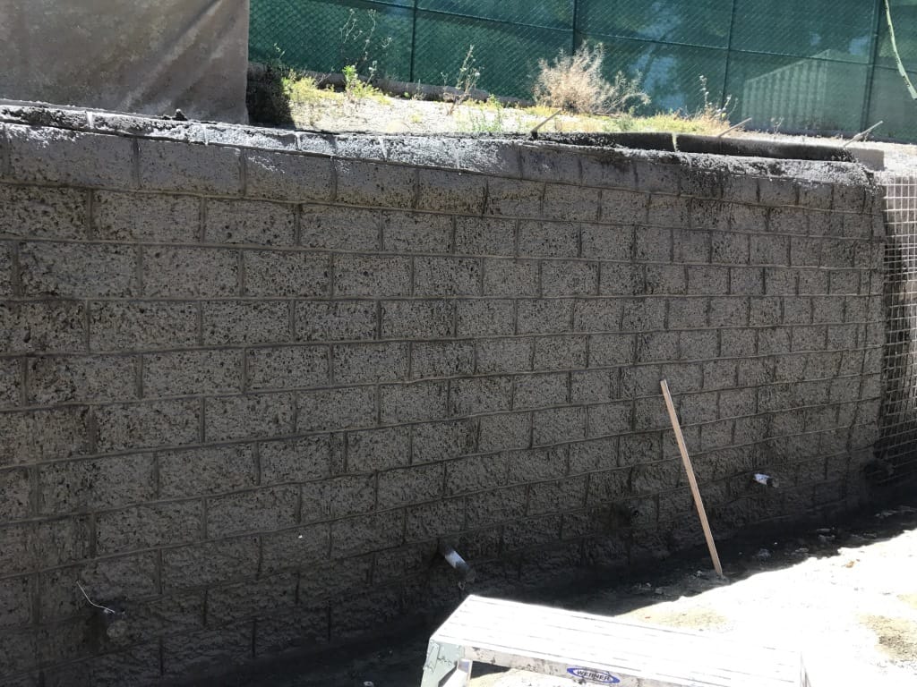 Shotcrete is sculpted to resemble a cinderblock wall, including grout lines and the rough texture characteristic of cinderblocks.
