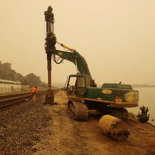 Our team of in-house engineers have extensive experience designing work adjacent to railroad tracks, making sure to follow AREMA guidelines as well as guidelines specific to the railroad at hand. One of our specialties is designing temporary shoring systems within the railroad’s right-of-way, which assists in the success of involved projects and construction in close proximity to train traffic. Our office and field personnel have worked adjacent to live track for decades and work professionally with railroad operators to minimize the impact of construction on train operations. Drill Tech has a proud history of clear planning and communication to facilitate efficient, safe, and cost-effective railroad services.